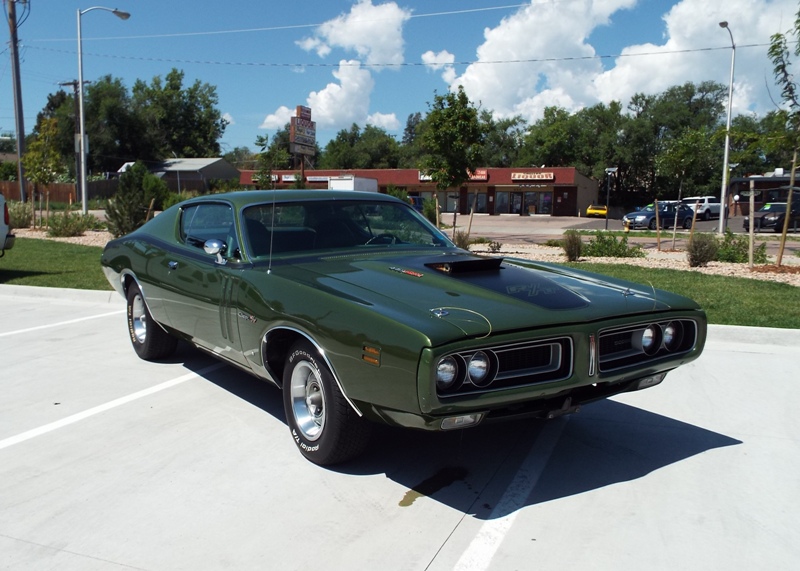 375 HP/440 MAGNUM R/T. (ROAD AND TRACK) OF THE 77,000 DODGE CHARGERS SOLD NEW IN 1971, ONLY 2659 WERE ORDERED WITH THE R/T PACKAGE. THE CAR HAS ORIGINAL GREEN METALLIC PAINT, WITH BLACK STRIPES. MATCHING DARK GREEN INTERIOR WITH BUCKET SEATS AND CONSOLE. CONSOLE WITH WOODGRAIN PANEL. MANUAL WINDOWS AND LOCKS. AM RADIO. ORIGINAL AND INCEDIBLY RARE RUBBER COATED FRONT AND REAR BUMPERS PAINTED TO MATCH THE METALLIC GREEN BODY. THIS CAR IS ONE OF 2172 BUILT AT THE CHRYSLER LYNCH ROAD ASSEMBLY PLANT IN DETROIT MICHIGAN. NUMBERS MATCHING 44O V8 WITH AIR GRABBER HOOD. ONLY 1119 UNITS WERE PRODUCED WITH THE AIR GRABBER HOOD. IT HAS THE A727 3 SPEED AUTOMATIC TRANSMISSION AND CONSOLE SHIFT. THE ODOMETER SHOWS 55,947 MILES. IS EQUIPPED WITH THE RALLYE WHEELS AND DARK ARGENT RALLYE CENTER CAPS AND TRIM RINGS.