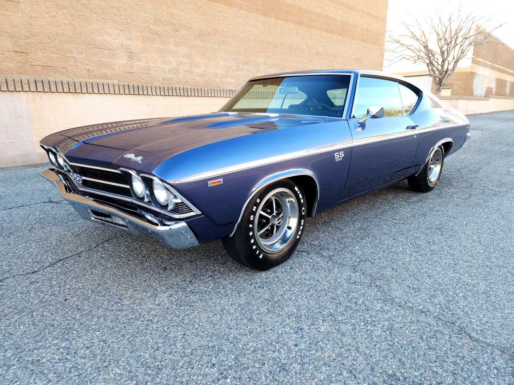 1969 Chevrolet Chevelle SS presented in dark metallic blue exterior with a black interior. This muscle car is powered by a 396ci 8- cylinder engine coupled to a 3-speed automatic transmission. It comes equipped with a 12- bolt posi-traction rear end, factory air conditioning that blows cold, power disc brakes and power steering. High end audio upgrades with Audison mid- range speakers for the cabin, custom subwoofer in the trunk, and a premium stereo unit in the glove compartment with Bluetooth connectivity. This is a highly restored bonafide Super Sport, previously a select offering from the world renowned Bryan Frank Collection