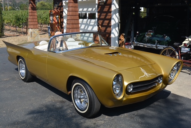 This is one far-out car that portrays the futuristic fantasy vibes of the late 1950s and has won at some prestigious car shows including The Oakland Roadster Show, Sacramento Roadster Show and Lead Sled East. It is an all- steel construction with all components welded in and skim-coated smooth. Under the hood, this show car features a high-performance 351ci Ford V8 engine mated with a Ford C4 3-speed automatic transmission, both rebuilt before installation. This engine sits in a show-prepared engine bay, with a custom air cleaner and Mickey Thompson rocker covers with -bar fasteners and gold detailing. The body is the hand-formed steel of a '57 Ford Thunderbird with a variety of body modifications and finished in a brilliant gold metallic paint. The large rear tailfins give it the iconic cult look. Other exterior modifications to this roadster include 1959 Lincoln headlights, 1959 Buick taillights, shaved door handles, a custom grille, tail panels and a chopped windshield. It was recently pinstriped by Tanner Leaser of Gas Monkey Garage. This astounding custom sits on four alloy wheels in a star pattern, wrapped in Dimension All Season whitewall tires. A striking feature is the fully custom white Naugahyde vinyl on the interior, wheel wells, engine bay and even the hood pad. This vinyl encases the seats and is diamond-pleated. The interior also features a 1961 Chrysler glass dome gauge cluster, '60s Plymouth Aero steering wheel, custom shifter, a retro rotary telephone attached to the center of the floorboard, and inside the glovebox is a Sony AM/FM stereo with CD player. The trunk has been equipped with a small, restored 1950s Admiral TV, oil, gas and water cans and a period-correct first-aid kit, all accented or sheathed in gold, plus a full-size spare tire. The car also comes with a custom-made tonneau cover.