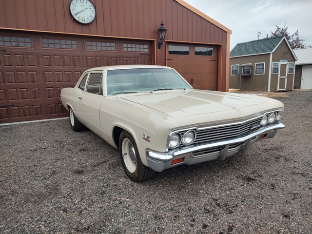 1966 Chevrolet Biscayne- Purchased from an estate- built in Los Angeles - original color ( Cameo Beige ) one of only 4 colors available on this model. Muncie 4 spd transmission - 850 cfm carb-12 bolt rear end with altered rear end-cooling fan shroud-scattershield- widened wheels-radio delete- Sun tach- now has a built up 454 engine- ground up restored