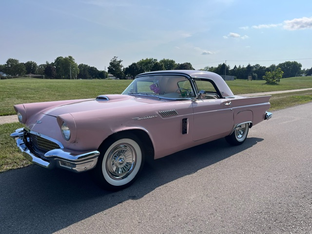 This is a one family owner rare Dusk Rose Thunderbird. I have the original bill of sale from my grandfather who purchased the “Pink Lady” as a birthday present for my grandmother in 1957. This car resided in Hennessey Oklahoma for 44 years until she was trailered to Wisconsin to start her restoration process and become road ready. Telescope steering wheel, original dashboard, visors and hub caps are just a few of the charms of this survivor. 292 Cu inch, V8 3 speed on the floor. The Pink Lady is looking forward to being driven and admired all year long
