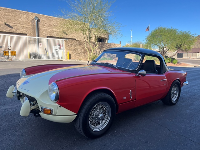 1968 Triumph Spitfire Mk3 Roadster -1.3L twin carburetor motor -4 speed manual with working overdrive -Red with Team Triumph livery -Rare hardtop -New alternator, battery, aluminum radiator, and many other new engine parts -Coilover shocks -Reupholstered seats -Nice banjo steering wheel -New aluminum fuel tank and sending unit