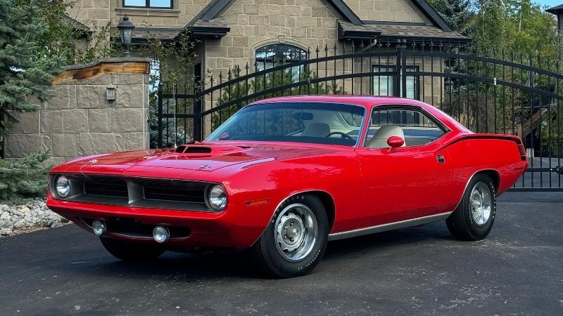1970 Plymouth Hemi Cuda - 426/425 HP V-8, Automatic, Rotisserie Restoration, Broadcast Sheet. Factory R-Code Hemi Cuda, Original broadcast sheet, Factory Red shaker and bumper car, Rotisserie restored, Original sheet metal, Factory correct FE5 Rallye Red with White bucket seat interior, Matching numbers 426/425 HP Hemi V-8 engine, Automatic transmission, Factory A32 car currently equipped with a 4.10 Dana rear end, Power front disc brakes, Original correct Kelsey Hayes brake rotors and calipers, Original brake booster and 2229191 master cylinder, Original glass, Original dash tag, fender tag and body numbers, Original K frame and suspension parts, Bucket seats and center console, Original Shaker assembly, AM radio, Rallye gauges, Dual painted racing mirrors, Original date-coded 15x7 Rallye wheels with NOS center caps, lug nuts and trim rings, Wheel lip moldings and Goodyear F70 Polyglas GT tires.