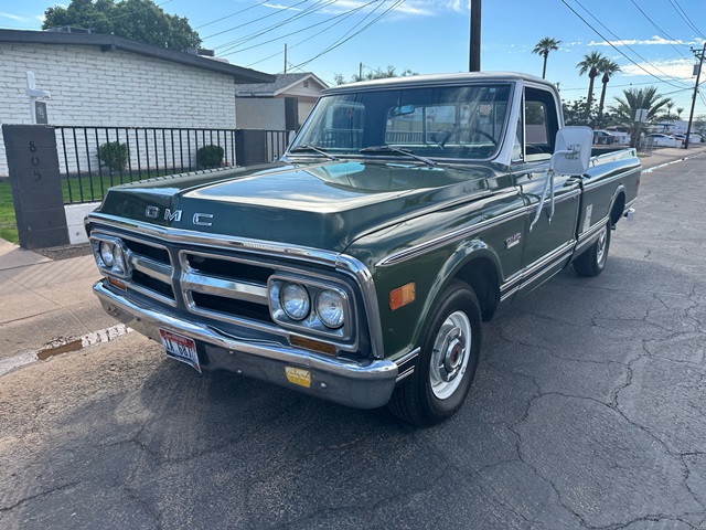 This is a one family owned 1971 GMC C10 from Idaho. After we purchased her, we replaced the seat covers, dash pad, and repainted the rear bumper. Comes complete with receipts, Idaho tags, original manuals and books. Starts right up, ready to use. This 1971 GMC 1500 received a basic restoration. It is originally from Idaho and is powered by a the original 350ci V8 engine and 3-speed automatic transmission. The body is free of Bondo and filler. The exterior is finished in GM original Olive paint with a matching bed. Added a new battery.