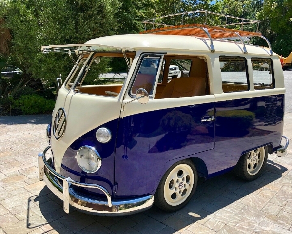 1966 Volkswagen bus that has been shortened and placed on a Nissan Leaf platform - Electric fun and fast. Beautiful blue and white exterior with tan leather interior