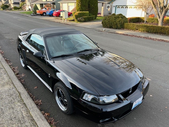 History report; No issues with State Title, Accident Damage, Recalls Odometer, or Service reports. Originally owner purchased - in Seattle, WA, 6/1999 – 3/2003, Owner, #2 Seattle = 3/2003 – 3/2008, Owner #3 Portland, OR = 3/2008 – 3/ 2022. #4 = Gordon Lusk. All Original, beautiful stock fun car. Never raced or wrecked. 4.6L All Aluminum, 32-V Dule overhead cam, hand-built motor. Runs strong and sounds good, 5 speed manual. Independent rear suspension and Cobra disk breaks all around. New wheels and tired installed 5/8/2023 at 88,218 mi. New led headlights. PRICE AS TESTED: $28,190 ENGINE TYPE: DOHC 32-Valve V-8 engine, aluminum block and heads, port fuel injection Displacement: 281 cu in, 4601cc Power: 320 bhp @ 6000 rpm Torque: 317 lb-ft@ 4750 rpm TRANSMISSION: 5-speed manual DIMENSIONS: Wheelbase: 101 .3 in Length: 183.5 in Width: 73.1 in Height: 53.5 in Curb weight: 3285 lb C/D TEST RESULTS: Zero to 60 mph: 5.5 sec Zero to 100 mph: 13.8 sec Zero to 130 mph: 27.6 sec Street start, 5-60 mph: 5.9 sec Top gear, 30-50 mph: 10.4 sec Top gear, 50-70 mph: 10.6 sec Standing ¼-mile: 14.1 sec @ 101 mph Top speed (drag limited): 149 mph Braking, 70-0 mph: 185 ft Roadholding, 300-ft-dia skidpad: 0.88 g FUEL ECONOMY: EPA city/highway driving: 17/26 mpg C/D observed: 16 mpg