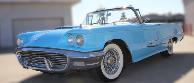 1959 PFORD THUNDERBIRD CONVERTIBLE Lot - 304 Highlights of this 1959 Ford Thunderbird convertible are: - 390ci V-8 - 4bbl Carburetor - Edelbrock Aluminum Intake Manifold - Weiand Valve Covers - Newer Radiator - Newer Hoses, Belts and Spark Plug Wires - New Battery - Cruise-O-Matic Transmission - Power Steering - Power Brakes - Power Windows - Power White Convertible Top - Polished Aluminum Spoke Wheels - Wide White Wall Tires - Two Tone Blue Vinyl Interior - Bucket Seats - Center Console - Auxiliary Oil Pressure Gauge - Exterior Finished in Cashmere Blue - Aftermarket Audiobaun A3451 AM/FM/CD Stereo Long term California ownership. With production of 67,456 Thunderbird units, only 10,261 were convertibles.