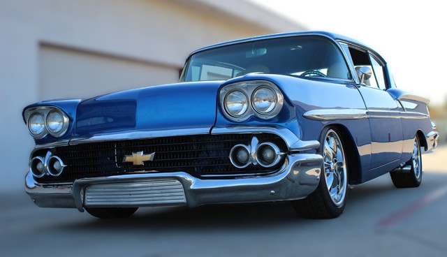 1958 CHEVROLET BEL AIR - The 1958 Chevrolet Bel Air showcases a one-year only design, making this particular model a truly unique specimen. The striking Lapis Blue exterior accentuates the distinctive sheet metal and bold tailfins emphasizing the car's muscular presence, while chrome accents outline the body's dynamic contours. The stance is classic lowered front, riding on 17-inch Foose chromed wheels wrapped in 225/45R17 front and 255/45ZR17 rear tires. Front disc and rear brakes provide a reliable smooth stopping ability. A bold interior motif is presented with light beige front bucket seats divided by a custom fabricated console housing the B&M shifter, while the matching door panels complete the unified design. The black carpet and headliner create a clean backdrop. The interior motif is continued with modern look gauges complimented with full width backing. A retro-style look radio brings modern audio capability while maintaining the classic original look. A chromed tilt steering column is topped with a comfortable spoke steering wheel. A 350 cubic inch V8 paired with a 3-speed automatic transmission delivers strong performance. The Demon carburetor feeds the V8, while the dual exhaust system exiting ahead of the rear wheels produces a proper V8 rumble. HIGHLIGHTS: One Year Only Design Stunning Lapis Blue Exterior Hi-Back Bucket Seats Console With B&M Shifter Door Handles Shaved Hood and Trunk Shaved 350 V8 Engine Chrome and Billet Dressed Engine A/C Aluminum Radiator With Auxiliary Electric Fan 3-Speed Automatic Transmission Demon Carburetor Dual Exhaust System LED Taillights