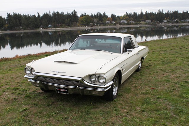 This 1965 Ford Thunderbird is a Fourth Generation model and shows very well. The body is straight and clean with fresh white paint that has very few chips and scratches. The beautiful red interior is accessed through a cavernous entryway when the doors are fully opened. Entry is made more gracious for the ladies with the included sliding steering wheel. Once seated, the "wrap- around" center console defines the driver area from the passenger section with "Jet-age" styling. The main windows are driven electrically, while the "wing-vents" are hand-operated. This generation of Thunderbird accents that mid-sixties "Right stuff" mentality. Under the hood is a very clean engine bay with a 390ci V8 mated to a 3-speed automatic transmission. The only modifications made have been in the form of more modern upgrades including an HEI distributor and the dual-reservoir brake master cylinder. This car came with AC, but the bracket and compressor were removed, and the lines plugged. That is a relatively simple modern upgrade for a new owner. For Ford, this was NOT a "sports" car. The T-Bird is considered a "personal luxury vehicle" and the trunk certainly brings that out. It is amazingly roomy and the bright red, wall-to-wall carpeting in this one is uber clean. Within the trunk are assorted spare parts for the vehicle to include fender skirts, original valve covers and brake cylinder, and other miscellaneous items. There are also shop and wiring diagram manuals included. The undercarriage is typical for a road going vehicle. The dual- exhaust is the highlight and there are no serious leaks present in the engine, transmission, or rear axle. This 1965 Ford Thunderbird was built during America's Race to Space and has all the "Right Stuff" for a new owner.
