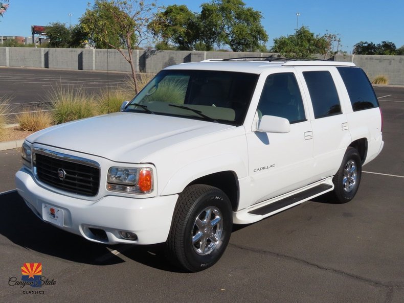 1999 Cadillac Escalade in 50U Aspen White over Neutral Shale Leather interior. This one-owner, elderly owned Escalade has lived its entire life in the SF bay area. The OBS series Escalade was only available in 1999 & 2000 and most examples have extremely high miles and spotty ownership. This truck has been well serviced and looked after by its main owner- thats why its so nice for the miles! This truck had an original MSRP of almost $47,000, so don't miss your chance to own this beauty for a fraction of what is invested!! The following is a list of options as this Escalade is currently equipped: - GM 5.7l V8 - Four Speed Auto Transmission - Dual Range Transfer Case - 16" Cadillac Six Spoke Alloy Wheels - Standard Tailgate & Hatch - Keyless Entry - Neutral Shale Leather Interior - Dual Power Seats - Rear Air Conditioning - Front Disc Brakes - Standard Tow Receiver - Bose Sound System - Running Boards - Heated Seats This Escalade is finished in Aspen White and has just been through our detail shop for a full cut, buff and hand wax! The body on the Cadi is totally solid and rust free as any lifelong CA truck should be, and it never saw salt. I have inspected the body and cannot find a single spot of rust. Minor scratches and blemishes are consistent with the miles and major ones have been pictured above. The axles and suspension case are all stock, and ride height has never been modified with any sort of a lift or lowering kit. This truck has never seen any off-road use or abuse judging by its perfect exterior condition. The factory Cadillac 16" alloy wheels are in nice shape and wrapped in newer truck radials. Everything runs and functions as it should. The interior is in great shape all around. All seats, door panels, carpets, and floor mats are in very nice condition and consistent with the overall fit and finish of this Escalade. The interior is extremely comfortable and well optioned with all the interior goodies. This Cadi features its original front seats, wood trim and center console- a testament to how well cared for this Escalade is! This Escalade looks great for the age, a true testament to the keen ownership. Overall condition of the interior is a 9 out of 10. Mechanically, this Escalade runs GREAT! It starts right up and shifts great. The 5.7L V8 engine has never been neglected and runs like a top! Every mechanical system on this Cadi was gone through and given a clean bill of health. The engine compartment was fully detailed to show condition. The truck is tight as a drum and doesn't leak a drop of anything. Everything under the hood is in excellent mechanical and cosmetic condition and OEM parts are used throughout. We put the truck through our shop, inspected it and replaced the following: spark plugs, plug wires, filters and driver door window switch. All in all, this is one heck of a nice truck to drive and will get compliments as well as stares everywhere it goes. If you have been searching for a very capable truck to work or play the search ends here. The truck has a clean Arizona title.