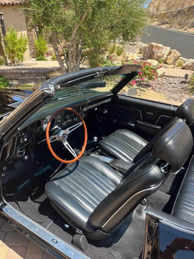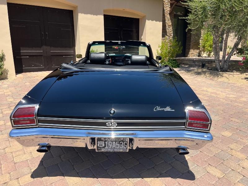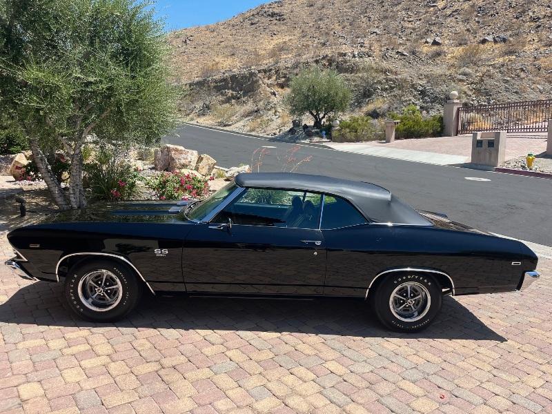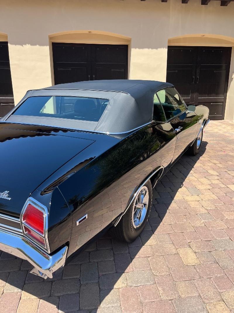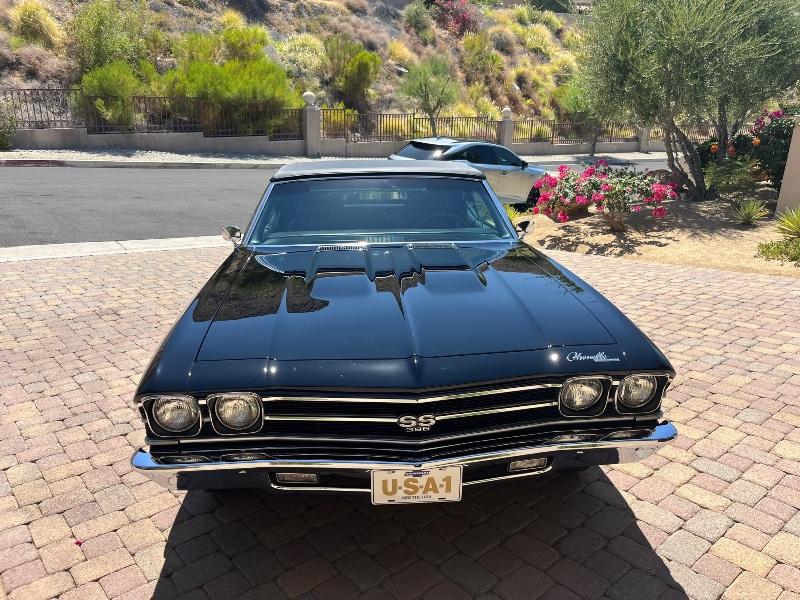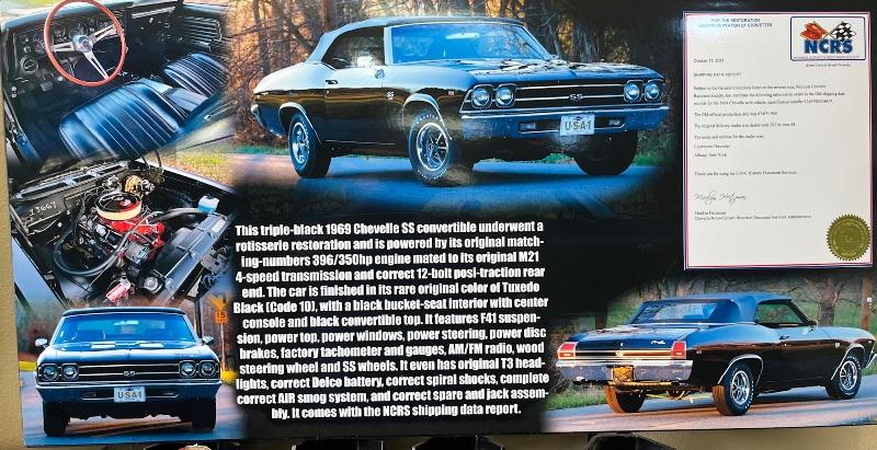 This triple-black 1969 Chevelle SS convertible underwent a rotisserie restoration and is powered by its original matching numbers 396/350hp engine mated to it's original M21 4-speed transmission and correct 12-boit posi-traction rear end. The car is finished in it's rare original color of Tuxedo Black Code 10, with a black bucket-seat interior with center console and black convertible top. It features F41 suspension, power top, power windows, power steering, power disc brakes, factory tachometer and gauges, AM/FM radio, wood steering wheel and SS wheels. It even has original T3 head-lights, correct Deico battery, correct spiral shocks, complete correct AIR smog system, and correct spare and jack assembly. it comes with the NCRS shipping data report.