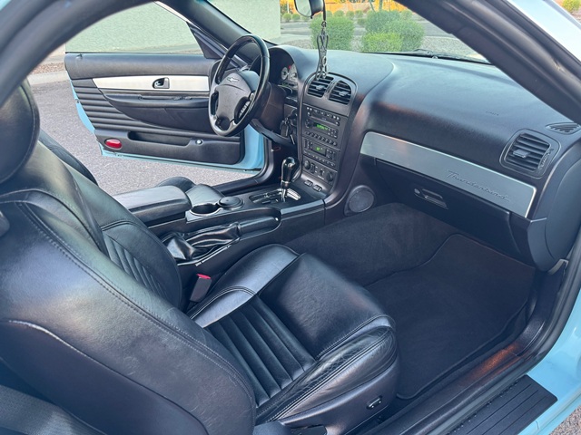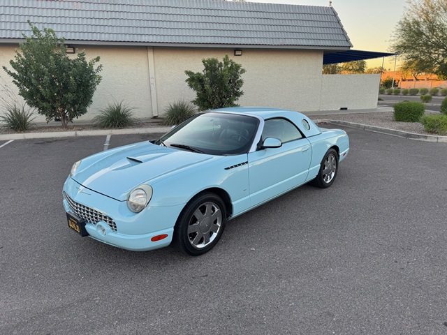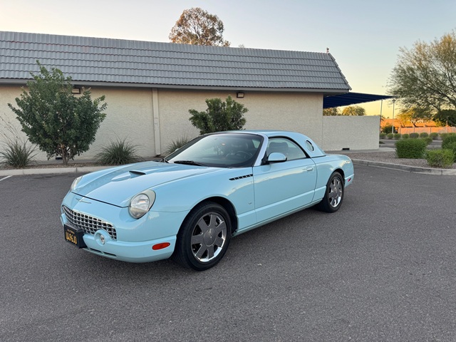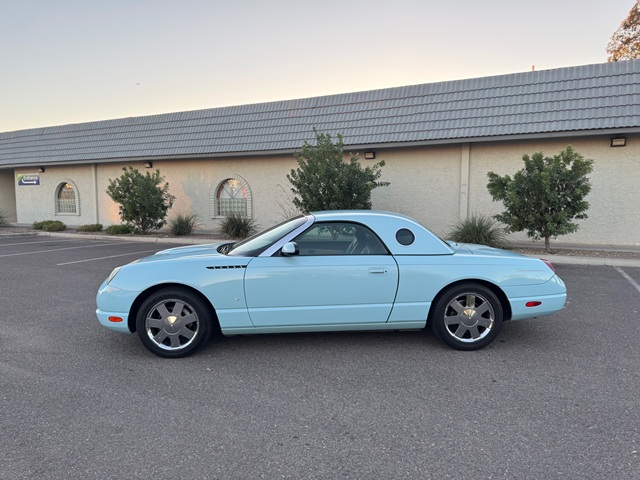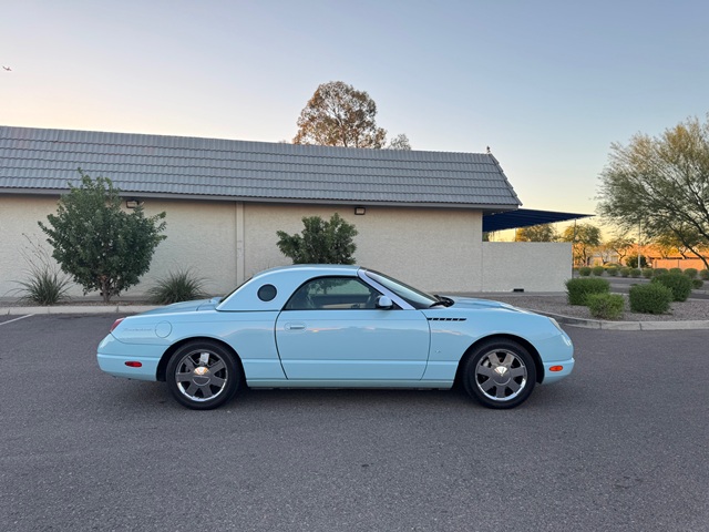 This 2003 ford thunder bird is powered by a 3.9 liter v8 engine backed by an automatic transmission. Rare limited production baby blue exterior . 2 top car with removable hard top and convertible soft top . Premium leather interior . Bucket seats with center console . Power windows and locks . Convenience package . Comfort package . Only 79000 actual miles . And rides on a set of thunderbird premium alloy wheels and tires. Original window sticker and maintenance records come with the vehicle.