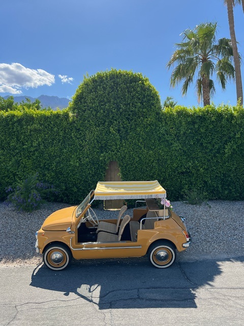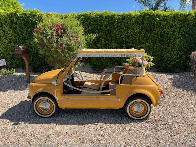 1971 Fiat Jolly Conversion has been converted to resemble a jolly model as part of a build completed in 2023 and is finished in yellow, with a yellow and white fringe Surrey top over wicker seating. The Jolly rides on a 12 inch steel wheels with white wall tires, and is powered by an air cooled 499 cc twin paired with a four speed manual transaxle. Further details include side, safety ropes, as well as tubular bumpers, and grab rails. This 500 F jolly conversion was completed in Podenzano, Italy with US registration.