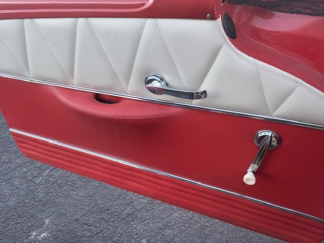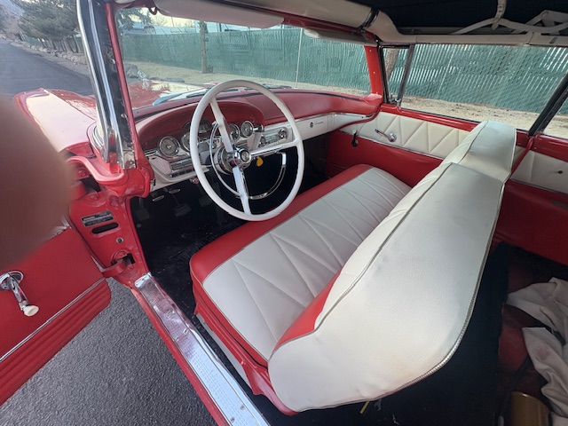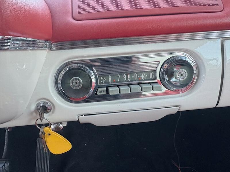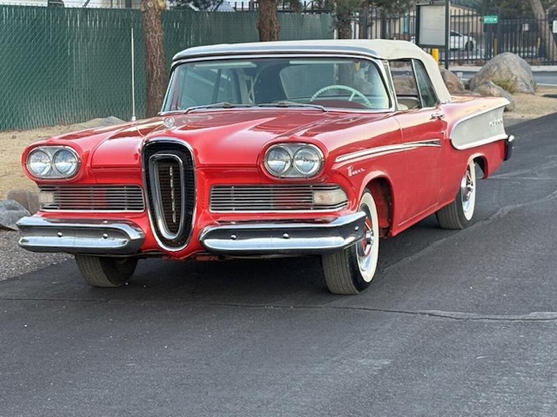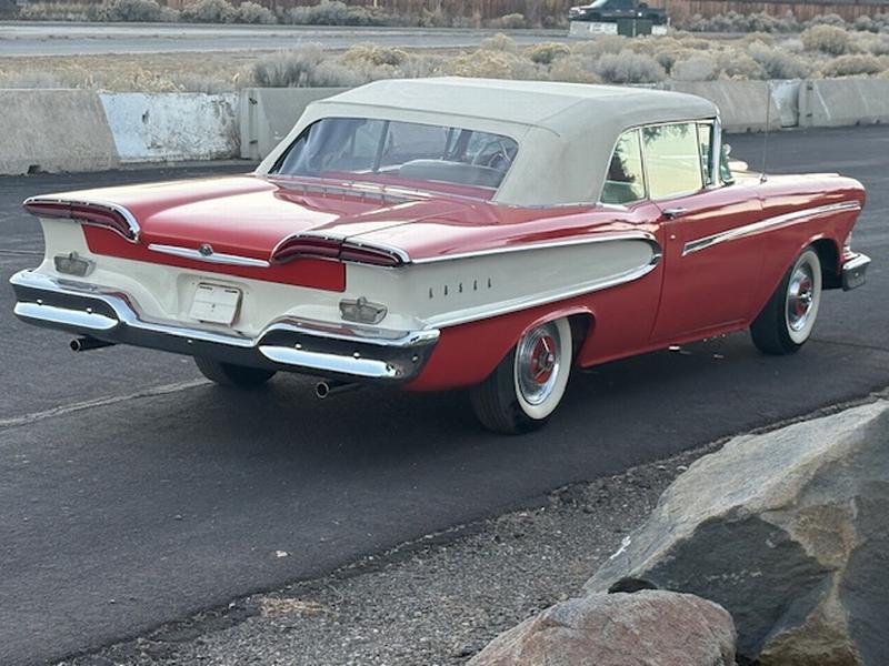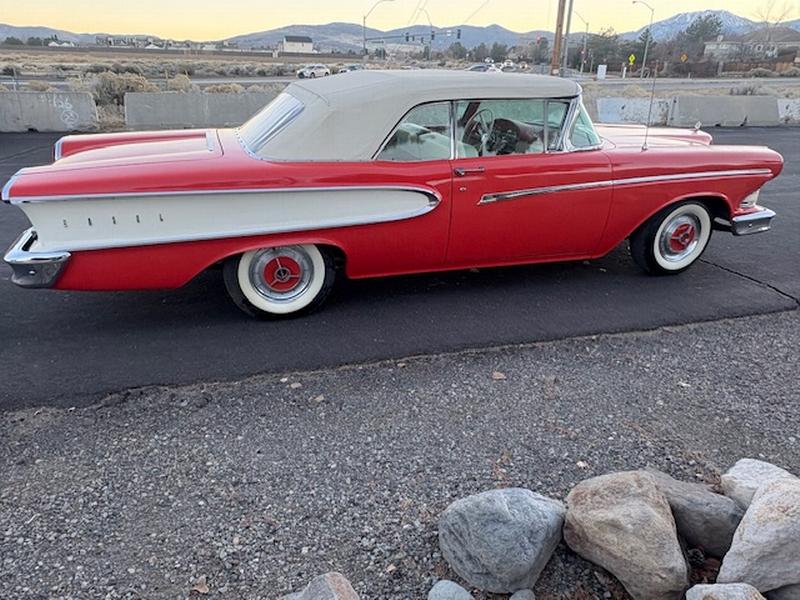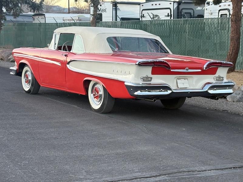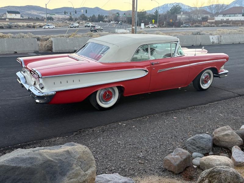 1958 Edsel Pacer Convertible - This 1958 Edsel Pacer Convertible is finished in Sunset Coral with a matching Sunset Coral and white pleather interior and features a power-operated convertible top. It is powered by a rebuilt 361ci V8 with a four-barrel carburetor, showing approximately 100 miles since rebuild, paired to a three-speed manual transmission and dual exhaust. Equipment includes a padded dash, factory AM radio, correct premium wheel covers, wide whitewall tires, polished stainless trim, and a fully carpeted trunk with spare tire. Recent mechanical updates include new brakes, wheel cylinders, and a new fuel tank. The car is described as rust-free. This Pacer previously resided for more than 25 years in the Garth Richards Auto Museum in Carson City, Nevada.