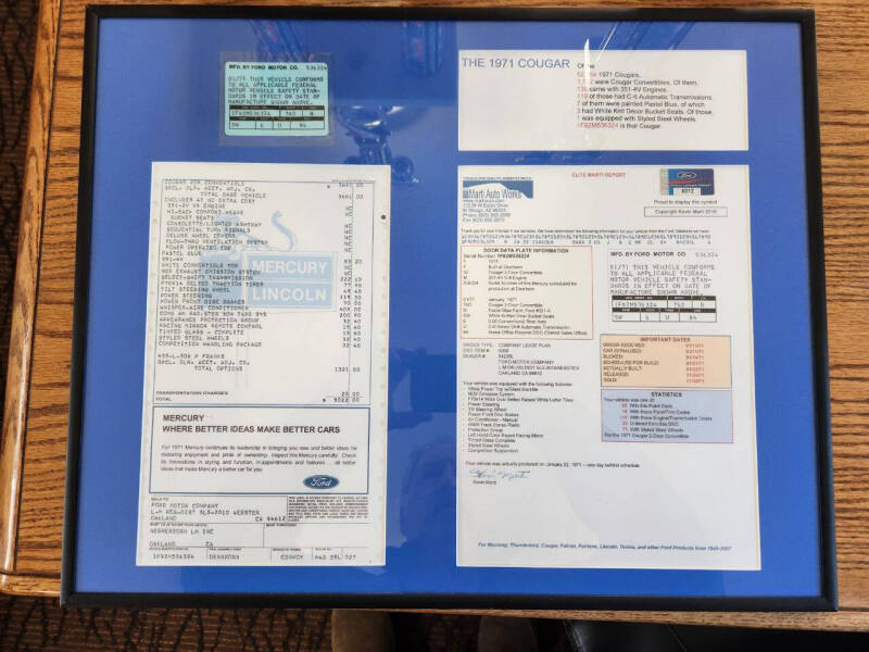 According to the Marti Report , this Cougar is the only one ever built with this equipment and color combination . It has the Cleveland 351 4bbl V-8 engine , the C6 transmission , air conditioning , am radio with an 8 track player and tilt column . It is Pastel Blue , code 921-A , with the White Knitted Vinyl bucket seats , code 5W , and a white power convertible top . The Styled Steel Wheels completed it's singularity of the 3 that were ever built with this color combination . Lady owned , who purchased it from the original owner , always garage kept , this trophy winning Cougar shows 58,800 miles , reported as actual to me , it runs and drives great , still shows very well and would enhance anyone's collection . First place trophy for "TOP CAT AWARD" at the 2016 Western Regional Cougar Club of America's show in Oakley California , second place overall finish . One repaint to the original Pastel Blue some 20 years ago combined with original interior and factory equipment makes this beauty an absolute survivor !!