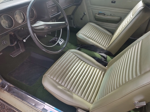1969 Mercury Cougar Eliminator Tribute...This Cougar still has original paint! It has added hood scoop, rear wing, eliminator stripes, and aluminum radiator. 351 V-8 automatic (FMX) transmission. The color is light ivy. It has a special order locking rear axle. New interior and windshield in 2026.