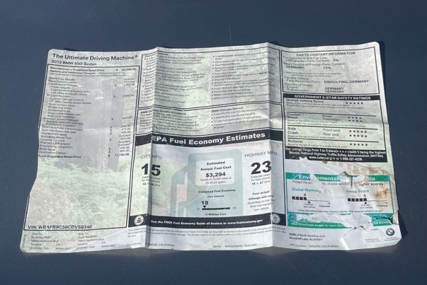 2012 BMW. 550i. Automatic. Cold AC. LOADED. CLEAN CAR FAX. CURRENT CA SMOG. Barely over 96,000 miles. Very low miles for 2012. Ready to roll recent Smog. Blows some smoke. drives great. air blows cold heated seats, sunroof great driver car for whoever low miles BMW quality.Smog done Extremely clean Car inside and out. Non Smoker. Space Grey Metallic Black Dakota Leather Convenience package Power trunk lift Comfort Access Keyless Entry