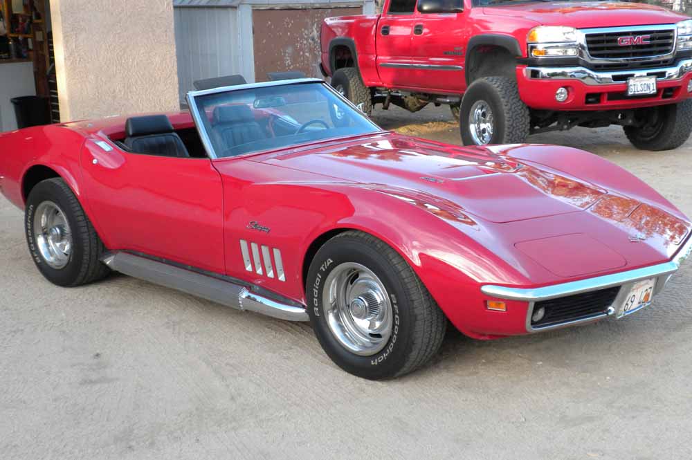 1969 Corvette Convertible, 2 tops, originally 427 motor 390hp and still is, but not matching numbers, 4 speed, ps, pb, era correct side pipes, rally wheels.
