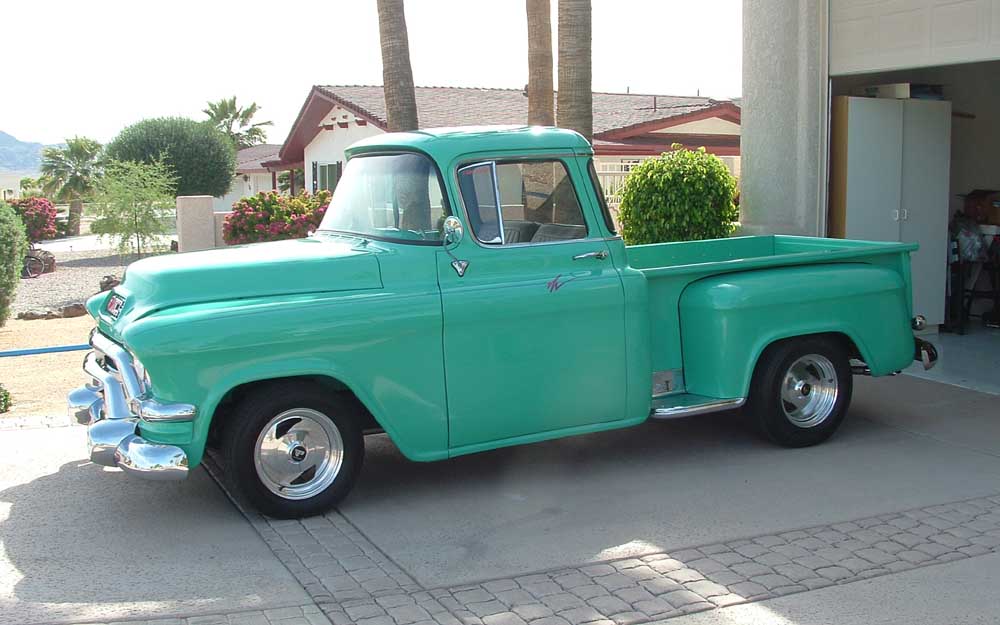 This GMC pickup is a frame-off restored stepside Model ZB55 with turquoise exterior with plum pinstripe, chrome and oak bed, a 305 cubic inch V8 Chevrolet Crate Engine, 350 Transmission, Dolphin Gauges, new radio, excellent A/C, Nova positraction rearend and Camaro front clip, full disk chrome wheels, complete cloth upholstery, and a wiring set-up for power locks and windows. There are 5700 miles on the truck since restoration. It is beautiful and runs great!