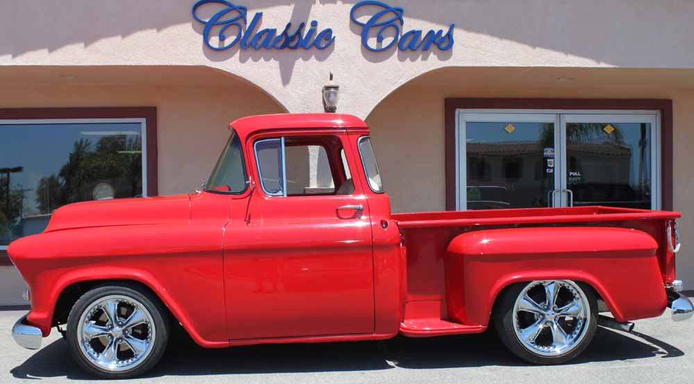 1955 Chevrolet 3100 w/big back window street rod pickup. Nova sub frame, with power steering, 12 bolt rear, 350 c.I. small block Chevy V8, Edelbrock airgap intake, Edelbrock 600cfm carb, headers, K&N air filter 350 turbo transmission w/shift kit. Dakota Digital gauges. New chrome grill, chrome front & rear bumpers, chrome alternator & bracket, chrome valve covers. Classic steering wheel w/tilt column. New carpet. New Foose Design wheels 20 rear 18 front w/Z-rated low profile tires. Seat belts (3), CD player. Well built truck with a clean straight body and great paint.