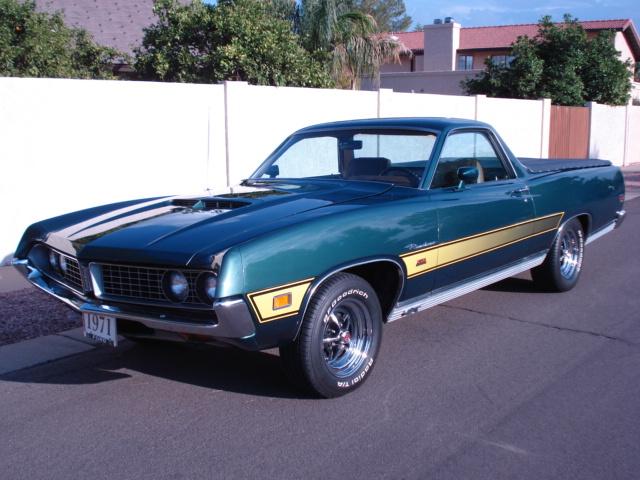 1971 Ford Ranchero GT. This Ranchero GT is powered by a 351 Cleveland motor, 2-V with a C-4 Cruise-O-Matic Transmission. This is a factory bucket seat option with factory A/C, and console shift.