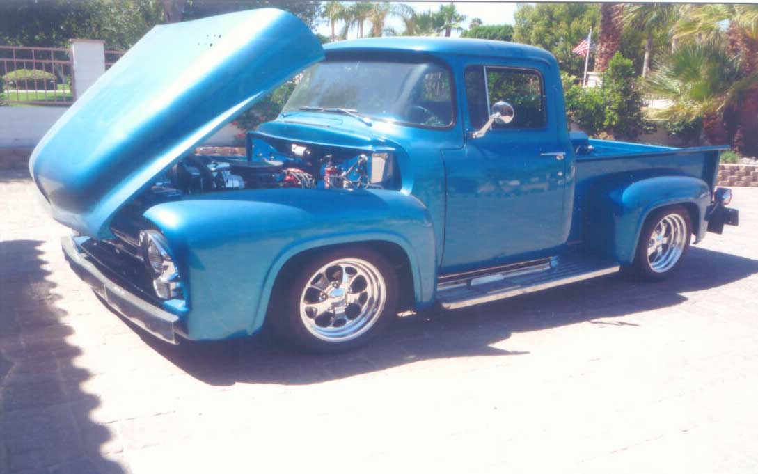 one outstanding custom pick-up truck with new chevrolet corvette aluminum heads 350 engine, candy blue paint with ghost flames,with chrome grill, bumpers, and running boards.