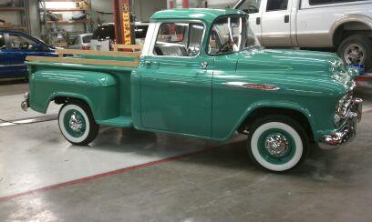 The Best of the Best. This 1956 Chevrolet 1/2 ton Pick-Up has undergone a complete 2 year full rotessire restoration. Featuring a 265ci engine w/ rare powerglide, this teel over white "BIG WINDOW" beauty is one one of the most desired among collectors.