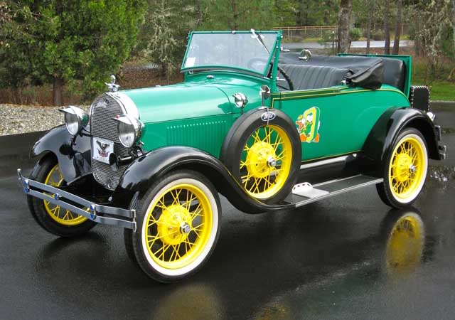 1928 Model A Roadster... Rumble seat with dual spare tires, All steel body, Glass air deflectors, radiator rock guard, 5 rear view mirrors, spare tire covers, cowl lights, headlight and cowl light visors, "Moto-Meter" radiator cap, rear luggage rack, trunk, top boot cover, heater, AM-FM Cassette radio, turn signals, electric wiper, up-graded shocks. Oregon Duck decal is magnetic.