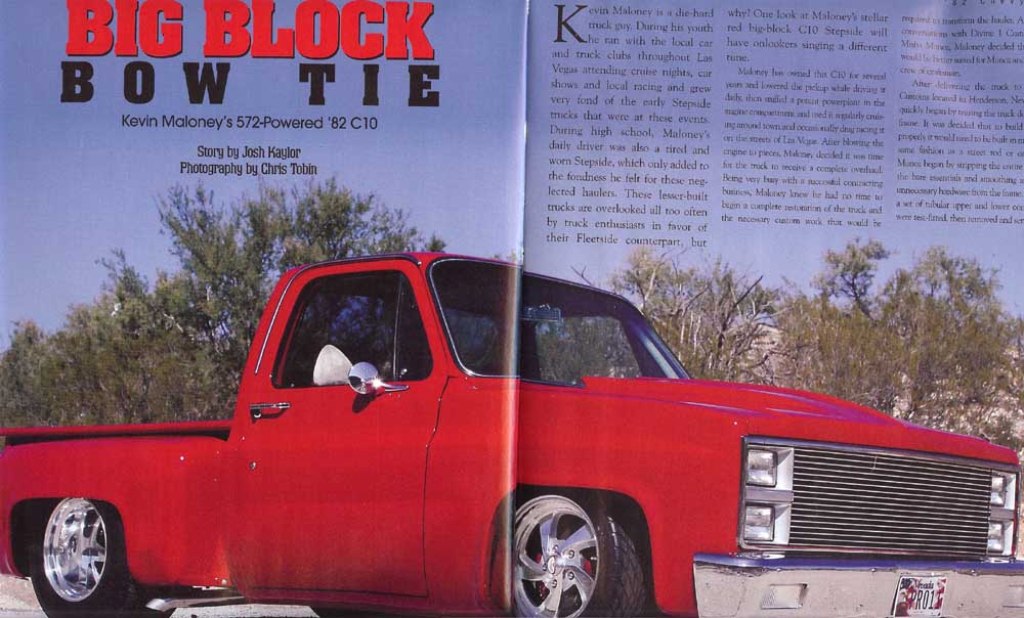 1982 C-10 Stepside Lowrider , PRO11, with a 572 Chevy Engine and a 4L80E Tranny ,750 HP. - Paint is Dupont Fire Apparatus Red - Rims a one off 17X9 and 17X15 Boyd Coddington - Tires are BF Goodrich - Suspension is Air Ride technology Shockwave 9000 - Interior - Red Leather over Grey Super Suede with a Kicker Show Quality Stereo IPOD Player - Winner of "Awesome Ride" award at Super Run Nevadas Largest Car Show - Winner of Best Truck in Class/ Best Truck in Show and Best of Show in countless car shows including the 3 Super Chevy Shows - Truck is on the Cover of BROTHERS Chevy Parts Catalogue Magazine - Truck is on the Cover of Sport Truck Magazine and Centerfold lay out - Truck is Featured in Truck Builder Magazine Centerfold lay out - Truck is Feature Vehicle in SEMA Show in Las Vegas for 3 Years - Truck is in Current Truckin' Magazine on BROTHERS Advertisments Monthly