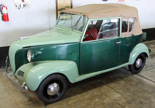 Powel Crosley, Jr. started producing the Crosley automobile in 1939. Crosley had previously brought us radios and refrigerators in the '20s and the '30s. His plan was to build America's lowest-priced car. They were mini compacts on a 80 inch wheelbase. The engine was an air-cooled, 12-horsepower Waukeshaw Four with two main bearings. It displaced 35.3 cubic inches. They were purchased at your local hardware and appliance shop, a novel if shortsighted marketing scheme. In May 1939, the first car was shown at the Indianapolis Speedway. It was a two-door convertible that weighed under 1,000-pound (454 kg) and sold for US $250. The vehicle has a three speed manual gearbox, 6 volt system, speedometer, amperes meter, oil gauge, original AM radio, windshield wiper, and red vinyl seats..... Older rust free restoration and a cute car!