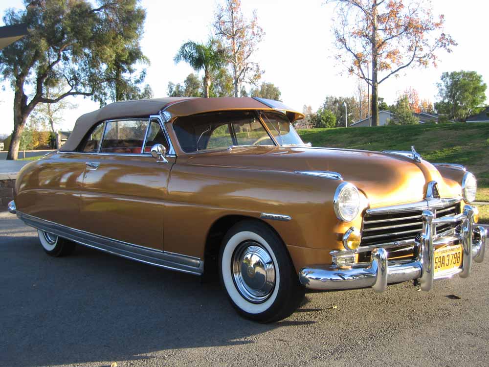 This 1949 Hudson Commodore Convertible was purchased from an estate in Kansas and brought to California where we did a full frame-up restoration about 4 years ago. The car is equipped with a Hornet 308 engine with Twin-H and a 3-speed overdrive transmission. Along with the gold exterior, it also has full maroon leather interior. It also includes accessories such as power windows, fog lights, an outside sun visor, grille guards, trunk lid guards, and YOM plates. Overall, an excellent looking and driving car.