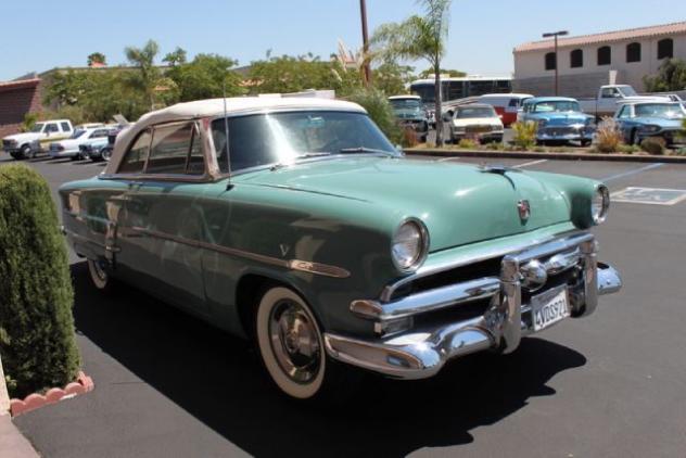 Ford Crestline Sunliner Convertible: 50 Year Anniversary Edition, Perfect Parade Car. Exterior is original color Fernmist Green with beige/tan convertible top, all stainless trim looks good, front and rear bumpers re-plated. wide white wall tires, dual exhaust. Jet hood ornament in perfect condition. Interior is in great condition, finished in period correct color and style in green/ ivory vinyl interior. Green dash is excellent , and has original factory clock mounted in middle, with factory AM radio. All factory gauges, heat and defrost, automatic on column, carpet is in great shape. Door panels are green/ ivory and look great, window cranks and door handles look good, rear view mirror looks good, green sun visors like new. Power convertible top operates like new and locks perfectly. Beautiful inside and out.