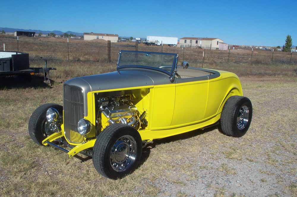 1932 FORD HIBOY ROADSTER--RUSSNOMORE FIBERGLASS BODY--CLASSIC STREET ROD MFG. CHASSIS--CHROME SO-CAL FRONT END ASSY.--DRILLED AXLE--HAIRPIN RADIUS RODS--ALUMINUM HUBS & BACKING PLATES--WILWOOD DISCS--UNISTEER RACK & PINON--9" FORD REAR W/ 3:50 POSI--31 SPLINE AXLES-- ALDAN EAGLE COIL OVERS--350 SBC COMPLETELY REBUILT W/ 500 BREAK-IN MILES--BUILT TURBO 350 TRANS W/ LOCAR SHIFTER--POLISHED INTAKE W/ EDELBROCK 600 CFM--FABRICATED ALUMINUM VALVE COVERS--3 HP CHROME STARTER--HEI IGNITION--PATRIOT CERAMIC BLOCK HUGGER HEADERS--ALUMINUM RADIATOR & SHROUD--SPAL FAN--WHEEL VINTIQUE CHROME ARTILLERY WHEELS W/BFG TIRES--CHROME GM TILT COLUMN--MUCH-MUCH MORE--ALL QUALITY CONSTRUCTION.THIS CAR IS TITLED, REGISTERED, LICENSED AND INSURED AS AN ORIGINAL ARIZONA 1932 FORD ROADSTER.