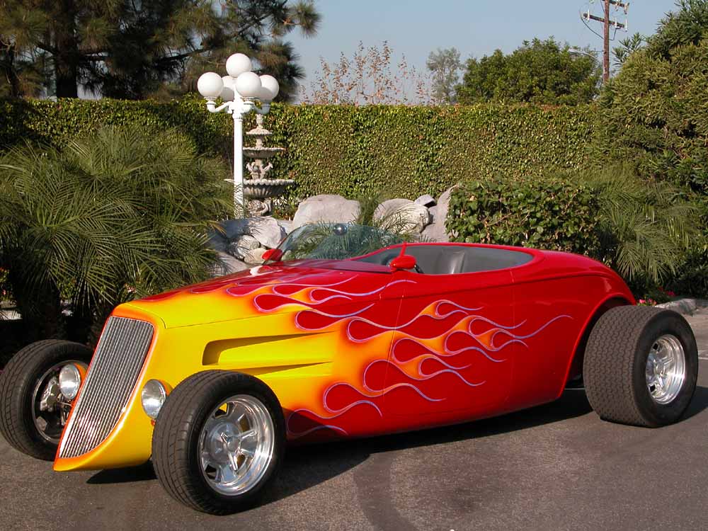 34" Ford Roadster with a 32 valve Oldsmobile Aurora V8, mounted in the rear.