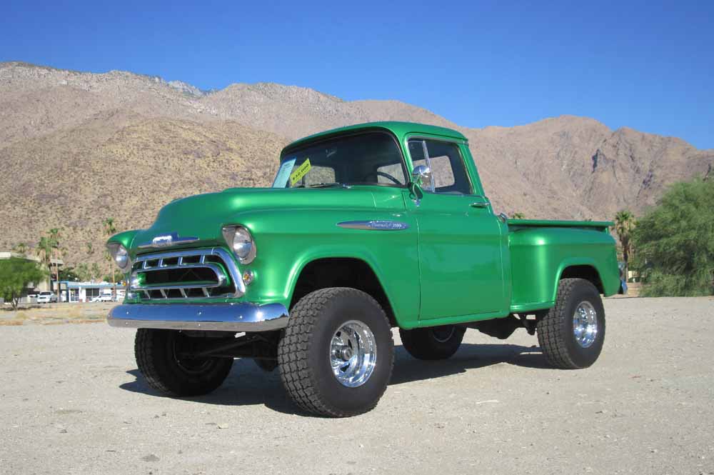1957 CHEVROLET TRUCKS NEVER LOOKED THIS AWESOME, 4 WHEEL DRIVE, GRANNY LOW FIRST GEAR,NEWER WHEELS AND TIRES....AWESOME SOUNDING EXHAUST MAKES THIS BEAST SOUND MORE LIKE A MONSTER AND THERE IS MORE ROOM FOR YOU TO GROW AND USE YOUR IMAGINATION IN THIS TRUCK, HAS A NEW WOOD BED, WAITING FOR YOU TO POLISH UP......