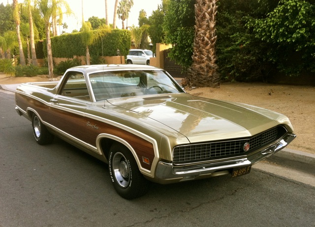 970 Ford Ranchero Squire. Light gold metallic with matching interior. Rare Hideaway headlights, Power steering, power brakes, automatic trans, factory air conditioning, original am radio, 302 engine, new BF Goodrich raised white letter radial tires, original California black plates. Marti Report