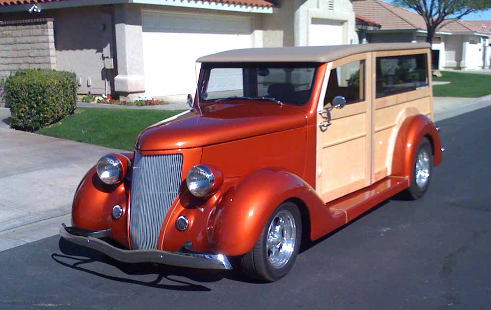 This classic 1936 Ford Woody is Burnt orange with tan interior. ALL STEEL with fiberglass fenders. Powered by a ZZ4 350 and backed by a turbo 350 transmission. Impeccable wood detailing and a killer sound system put this gal in a world all her own.