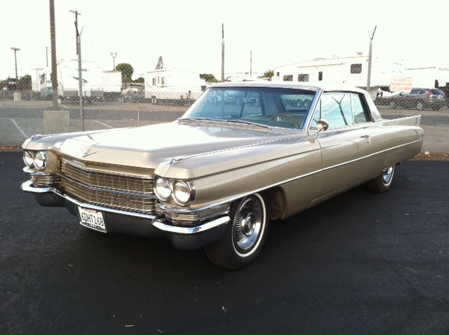 1963 Cadillac Coupe de Ville, gold with creme interior. Only two owners and 119' miles. Original paint! Original chrome! Original interior except partly recovered seats. This car has always been garaged and always under cover. No rust, solid, always in California. Chrome is fantastic just like the side trim, the tinted glass and all stainless. Interior is very well kept. Some of the seat panels recovered in faux leather similar to original, the instruments, steering wheel, all knobs and levers are in excellent shape, and no cracks on the dash. Engine bay is all original and the car runs and drives superbly. Fully loaded as a Cadillac should be: Power seat, windows, ps, pb, AC, cruise, autronic eye. Trunk is all original and very nice, with its 1963 carpet and carton on the sides, spare wheel, floor jack in its original fasteners, even the wooden block is there! This is a car for people who want to cruise. Same age as MKL:s "I have a dream speach" and the same year as JFK was shot in Dallas.