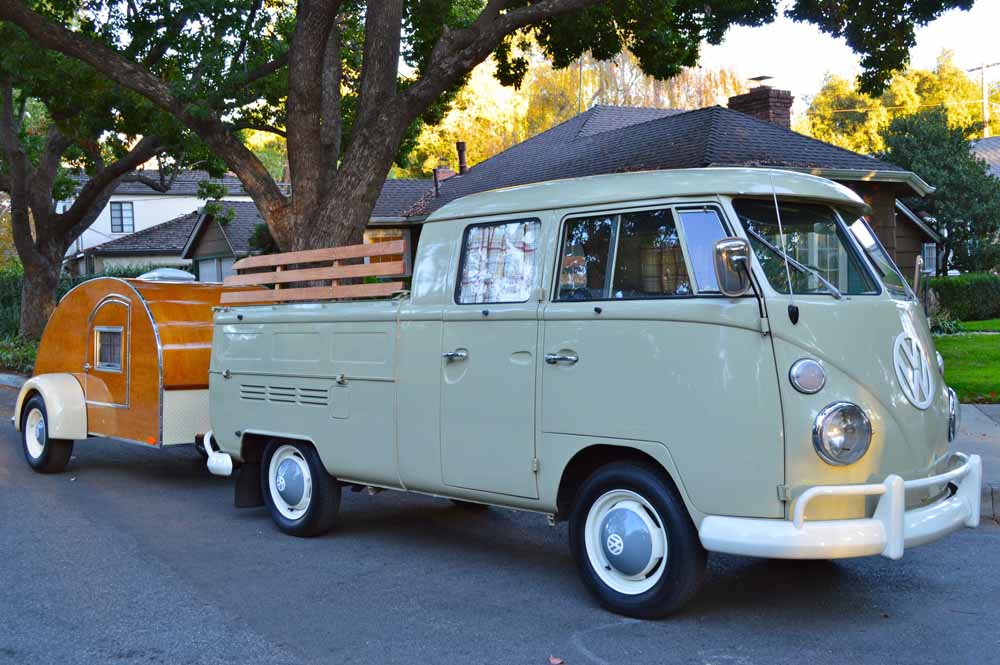 1967 Volkswagen Double Cab, 2007 nut and bolt rotisserie restoration built to factory vin code specs, AE 1600cc 60HP Motor, Stock matching 4 speed transmission, original factory VW glass, original factory VW Keys, original factory wheels, new factory code interior, dual cargo lamp options, rare original wiper washer fluid tank,every OEM part used to complete build absolutely zero rust, all gauges lights horn etc work! Cherry stained stake-sides wood matching Custom Teardrop Trailer, Matching Plaid Curtains. A True Show Stopper! More Looks than any high end sports vehicle! 2013 Special Construction "VW Teardrop" Trailer. A 6 year simultaneous project. A fully custom built frame sitting on Volkswagen axle beam for matching width, one inch solid Birch Wood sealed, stained and treated, the underneath is sealed and just as beautiful. This is a "one off" matching trailer. 6 foot Tempurpedic foam bed, water pump with water heater, 3 gallon water tank, custom coleman stove, 12V LED Lighting, his and hers reading lamps, 110V RV Hook-up with trickle battery charger, 3 110V receptacle with dual USB Ports, Airsteam inspired twist vintage vent windows with matching curtains, 12V ceiling ventilation fan, custom military battery box, 30's Ford taillights. This is truly one custom matching trailer!