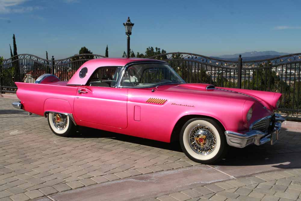 ONE OF A KIND SHOW QUALITY, 1957 CUSTOM BUILT, FORD THUNDERBIRD CONVERTIBLE PRESENT OWNER PURCHASED THIS REMOVABLE PORT HOLE HARDTOP CONVERTIBLE T-BIRD IN 1997 IN VERY GOOD CONDITION AND HAD A FRAME ON RESTORATION PERFORMED BY “PRESTIGE THUNDERBIRDS”. WAS CUSTOMIZED BY THE OWNER OF “RANGER PERFORMANCE CUSTOMS” FOR HIS WIFE, AND INCLUDES A CHROME PLATED CHROME MOLY TUBING ROLL BAR WITH OVERHEAD HOOPS AND WINDSCREENS, POLISHED STAINLESS STEEL DASHBOARD INSERTS, POWER WINDOWS, VINTAGE A/C AND HEATING SYSTEM, TELESCOPING STEERING COLUMN, BUDNIK BILLET ALUMINUM STEERING WHEEL, POWER STEERING. FRONT SUSPENSION: COMPLETELY REBUILT AND KYB SHOCKS, PERFORMANCE ANTI-ROLL BAR. REAR SUSPENSION: KYB SHOCKS AND PERFORMANCE ANTI- ROLL BAR. CUSTOM FABRICATED CONTINENTAL KIT (57 T-BIRDS DID NOT HAVE A CONTINENTAL KIT), CUSTOM ROADSTER SPOKE WHEELS WITH GOLD NIBS AND SPINNERS, RADIAL TIRES, FRONT DISC POWER BRAKES. ENGINE 312 CU IN. 245 HP. Y-BLOCK W/CHROME & STAINLESS ACCENTS, HOLLEY FOUR BARREL HIGH PERFORMANCE CARBURETOR, PERTRONIX ELECTRONIC PERFORMANCE IGNITION, CONCEALED NEW OPTIMA BATTERY WITH CTEK GEL BATTERY CHARGER, TOGGLE SWITCH POWER DISCONNECT, CUSTOM EXTRA CAPACITY RADIATOR, MECHANICAL AND ELECTRIC COOLING FANS WITH ELECTRONIC COOL DOWN SYSTEM (THIS ENGINE WILL NEVER OVERHEAT), REBUILT FORDOMATIC TRANSMISSION, CUSTOM HEADERS WITH ELECTRONIC EXHAUST CUT OUTS, FLOWMASTER MUFFLERS, CUSTOM FABRICATED STAINLESS STEEL LINES AND HOSES, SHOW QUALITY CHROME AND STAINLESS THROUGHOUT. CUSTOM LEATHER EMBROIDERED BUCKET SEATS & INTERIOR WITH CUSTOM DOOR PANELS AND HEADLINER WITH EMBOSSED T-BIRDS, FULLY UPHOLSTERED TRUNK, VIDEO SCREEN, VCR, AND CD CHANGER. CUSTOM AUTOSOUND ELECTRONICALLY TUNED AM/FM RECEIVER/CD TUNER WITH CASSETTE PLAYER FOR THE GREAT CLASSIC VEHICLES AND POWER ANTENNA BY “STITCHCRAFT WORLD FAMOUS CUSTOM INTERIORS”. UNIQUE PEARLESCENT HOT PINK CUSTOM MIXED “HOUSE OF KOLOR” PAINT, WITH CUSTOM PAINT FADES AND DIAMOND GLITTER BY WORLD RENOWNED PAINTER “PETE SANTINI”. SPECIAL NANOTECHNOLOGY PROTECTIVE SEALANT TREATMENT BY “ITEK PRODUCTS” THAT MAKES THIS CAR WATER, DUST AND OIL REPELLANT AND EXTREMELY EASY TO MAINTAIN THE VERY LONG LASTING SHOW CAR SHINE. THIS TROPHY T-BIRD HAS BEEN GREATLY ADMIRED AT VARIOUS CAR SHOWS AND HAS WON NUMEROUS BEST OF SHOW, BEST PAINT, TOP PICK AND PEOPLE’S FAVORITE TROPHIES AND AWARDS. ONLY THE VERY BEST HAVE WORKED ON THIS CAR. THIS IS THE PERFECT SHOWPIECE TROPHY CAR!