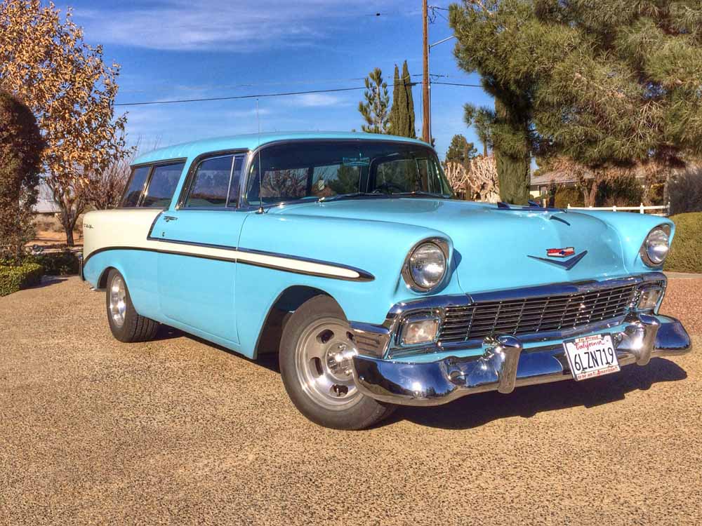1956 Chevy Nomad (OVER $100,000 spent on the restoration)... Nassau Blue and India Ivory with matching interior, Bow Tie 700 R4 Overdrive Transmission, Period correct American Mag wheels, Full body off restoration, All new Glass, All new chrome and stainless redone and or polished, Ciabella Interior matching the Nassau Blue and India Ivory ( Ciabella was the origional Mfg. of interiors), Nos rear flooring dyed to match interior, Custom Autosound Radio with Aux plug Vintage Air Gen IV, Original gages restored and recalibrated, BeCool dual elect fan Aluminum 4 core Radiator, Dynaflow Insulation, Ultraflow mufflers with 2.5 inch exhaust pipe, CPP 500 Steering box (Power Steering). 1967 Chevy 327 engine completely rebuilt with: 202 heads, Roller Rockers, MSD Ignition, Polished Aluminum Intake, Edlebrock Carb., Ceramic coated Ramshorn exhaust manifolds, M and H Wiring loom, Old Air Pulleys and brackets, New Danchuck gas tank and sending unit... This is a complete 100 point nut and bolt restoration Car Looks perfect, and runs and drives to match.