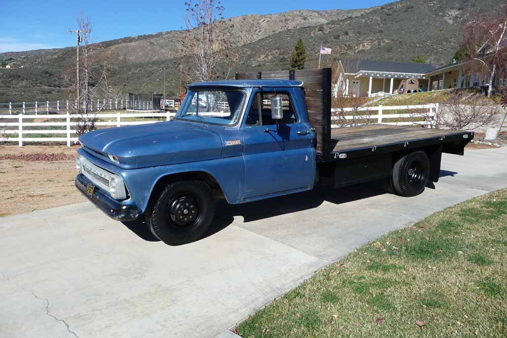 1965 CHEVROLET C30 DUALLY, FIRST YEAR FOR THE 157 INCH WHEEL BASE, ORIGINAL OAK BED AND REDWOOD HEADBOARD, ONE OWNER TRUCK WITH 68,000 MILES, BUILD SHEET AND PROTECTO PLATE, USED AS A FARM / RANCH TRUCK IN MODESTO, CALIFORNIA.