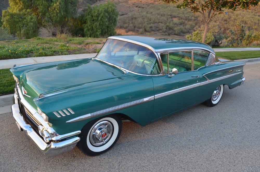 1958 Chevrolet Bel Air Sport Coupe...This is frame off, nut & bolt restoration of a low mileage, rust free, original car. Showing only 56,000 miles this 1958 Bel Air 2 dr hardtop Sport coupe features the optional 348 Cubic Inch Turbo Thrust engine with the optional Turbo Glide transmission. Power steering and dual exhaust. Beautiful Forest Green exterior with Med Green cloth and vinyl 3 tone interior It runs, drives, looks and even smells like a new car!