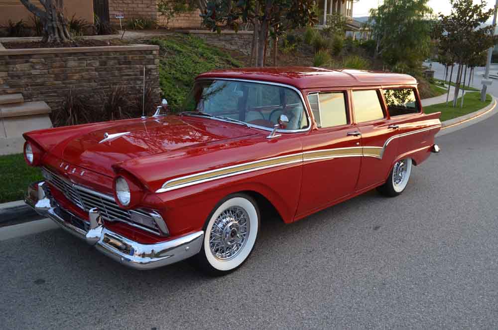 1957 Ford Country Sedan wagon, beautifully restored to "way better than new" with upgraded brakes (4 wheel disc), gorgeous paint, Kelsey Hayes wire wheels with Coker wide whites and featuring the 312 "Thunderbird Special" engine with Auto Trans.