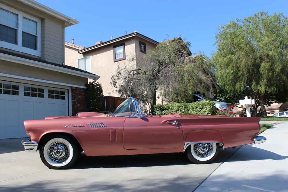 1957 Ford Thunderbird, original color inside and out ( Thunderbird Bronze ) with both tops hard and soft, ( white ) Has 312 cubic inch V 8 engine, front disk brakes, AC, wire wheels, secret stereo system, had a frame off restoration done 6 years ago, with low mileage since.