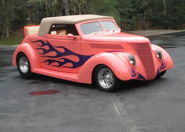 1937 Ford Cabriolet Convertible... Gibbons fiberglass body with Carson removable top, 350 Chevy with THM 350 trans, Ford 9 inch rear, Front disc, rear drum brakes, Custom frame, coil front leaf rear, Rack & pinion steering, Vintage A/C and heat, AM FM CD with power amp, Power windows, door release and rumble seat, Vacuum rear license fold down, Billet Specialties directional wheels, Magnaflow dual exhaust.