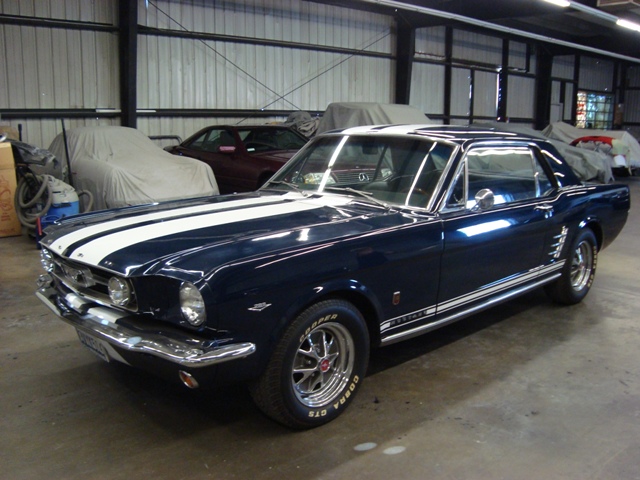 A beautiful local southern California car! This mustang has very low miles, black leather interior, with white racing stripes on the exterior.