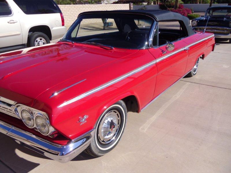 1962 Chevrolet Impala S.S Convertible. Has 409/409 engine but not the original engine. Full frame off rotisserie restoration- rare 409- with dual fours 4 speed and 4:11posi traction- correct tuxedo black interior with bucket seats- laser straight body and red exterior.