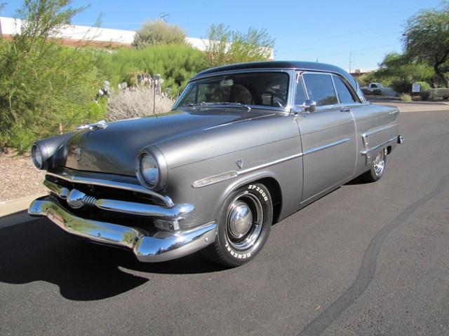 1953 Ford Crestline is straight as an arrow and is showing only 96,986 miles on the odometer. It is painted in a very glossy gray metallic and black top. All of the chrome and trim are in excellent condition as is the tinted glass. Setting off the exterior are original style steel wheels with Ford small hub caps and chrome trim rings wrapped by General RWL tires. The interior is in “Near New” condition and features gray cloth bench seats, excellent door panels, side panels, headliner and carpets. The dash is also in exceptional condition with all original gauges, factory push button AM radio, factory clock and aftermarket water temperature gauge. The drive train features a Ford Flathead 239 CI V8 that is fully dressed and upgraded with Offenhauser heads, an Offenhauser intake with dual carbs, and chromed headers all backed by an automatic transmission. Brakes have been upgraded to a dual master cylinder set up and the electrical system has been upgraded to 12 volt with regulator. This is an outstanding car.