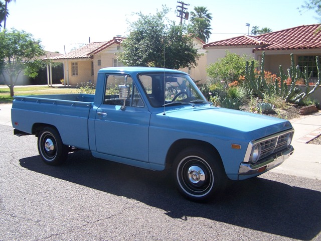 1972 Ford Courier... The Courier was manufactured by Toyo Kogyo (also known as Mazda), and imported and sold by Ford as a response to the unforeseen popularity of the small Toyota and Nissan/Datsun pickups among young buyers in the west. Like the other mini-pickups of the time, it featured a sub-2 liter four cylinder engine, a four speed manual transmission, rear wheel drive, an impressive load capability considering its size, and a fairly large price tag compared to full size pickups of the time. The Ford Courier sold for $3,000 when introduced -- close to the price of an F-100. When it was introduced it came standard with a 1.8-liter overhead cam engine, which produced 74HP at 5000rpm, and 92ftlbs at 3500rpm. A 4 speed manual transmission was standard. The body styling, especially the front grill, was designed to reflect the styling of the F-series lineup of the time, so it obviously looked like a little Ford Truck. The 1.8 liter (109.6 cu in) overhead cam engine produced 74 horsepower at 5,000rpm, and 92 ft-lbs of torque at 3,500rpm. It was a long stroke engine (3.07" bore x 3.7" stroke) with a chain driven cam shaft. It was coupled to a 4 speed manual transmission. For the first 5 years, this was all that was available. The styling of the Courier's grill was designed to reflect the design of the F-series pickups of the time. Note the similarities to the 1973 F- 100. This is an excellent condition older restoration ARIZONA Courier with only 92,000 miles. ZERO Rust. Still comes with her original drive train. She is all serviced and ready to show. Comes with dealer installed A/C unit.